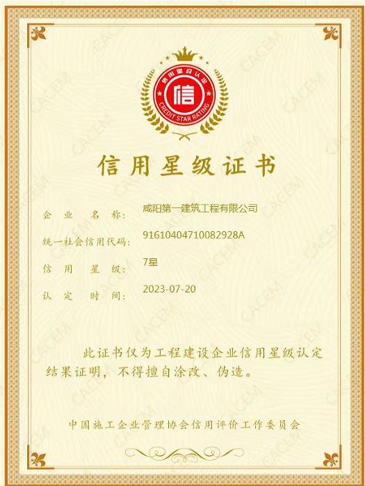 為加快推動工程建設(shè)行業(yè)信用體系建設(shè),中施協(xié)下發(fā)了《工程建設(shè)企業(yè)信用星級管理辦法》文件,并組織開展2023年工程建設(shè)行業(yè)“誠信授星活動”。我公司按文件要求積極申報,經(jīng)過陜西省建筑業(yè)協(xié)會推薦,中國施工企業(yè)管理協(xié)會的層層嚴(yán)格評選,2023720日正式公布評定結(jié)果,我公司被中國施工企業(yè)管理協(xié)會認(rèn)定為“2023年第十批工程建設(shè)企業(yè)信用星級企業(yè)”,榮獲“七星級信用”稱號,并獲得了中施協(xié)頒發(fā)的信用星級證書。